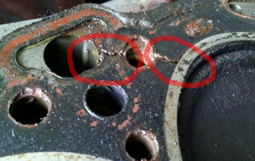 - Прогар (пробитие) прокладки головки блока цилиндров. В результате возникает опасность попадания антифриза в цилиндры силового агрегата и систему смазки или смешивание жидкости в системе охлаждения с используемыми для смазки маслами. Признаками неисправности служат белый дым из выхлопной трубы автомобиля, пар из-под крышки капота (при пробое наружу), образование эмульсии в расширительном бачке и/или масляном картере. Неисправность требует немедленного вмешательства, поскольку ухудшение качества масла и ОЖ чреваты перегревом силового агрегата, ускоренным износом шеек коленчатого вала, проблемами с распредвалом, цилиндро-поршневыми группами, заклиниванием двигателя. Прокладка требует замены.