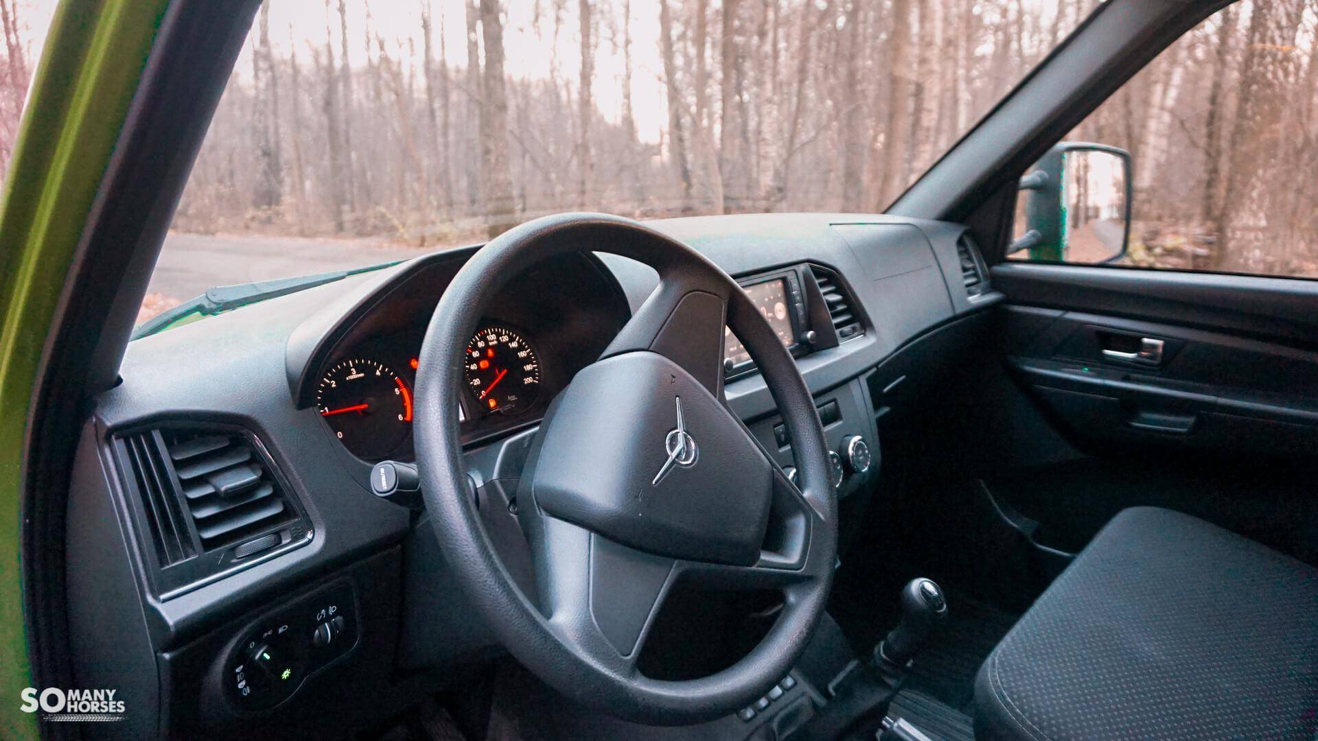 Первый момент – относительное неудобство попадания в салон. Если водитель может схватиться за рулевое колесо и затянуть себя в кресло, пассажиру придётся тянуться к «ручке страха». В салоне отсутствуют элементы «комфорта», такие, как подстаканники. В документах был анонсирован подстаканник на задней стенке кабины, но пользоваться им не получилось. Очень жаль, что головная оптика осталась старой, и фары от нового «Патриота» остались недоступны. Понятно, что это связано с удешевлением автомобиля для коммерческого покупателя, но всё же. Также непонятно, по какой причине автомобиль получил круиз-контроль, но не получил подогрева руля.