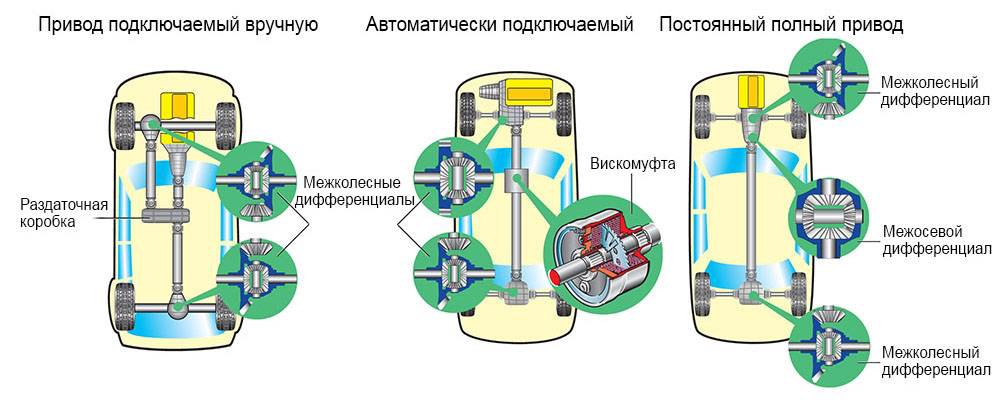 Они могут проехать небольшую лужу или забраться на бордюр, но месить на них грязь не стоит. А все из-за того что раздаточная коробка у них имеет блокировку дифференциала со склонностью к перегреву при частом буксовании. Делается она на основе одной из трех систем: