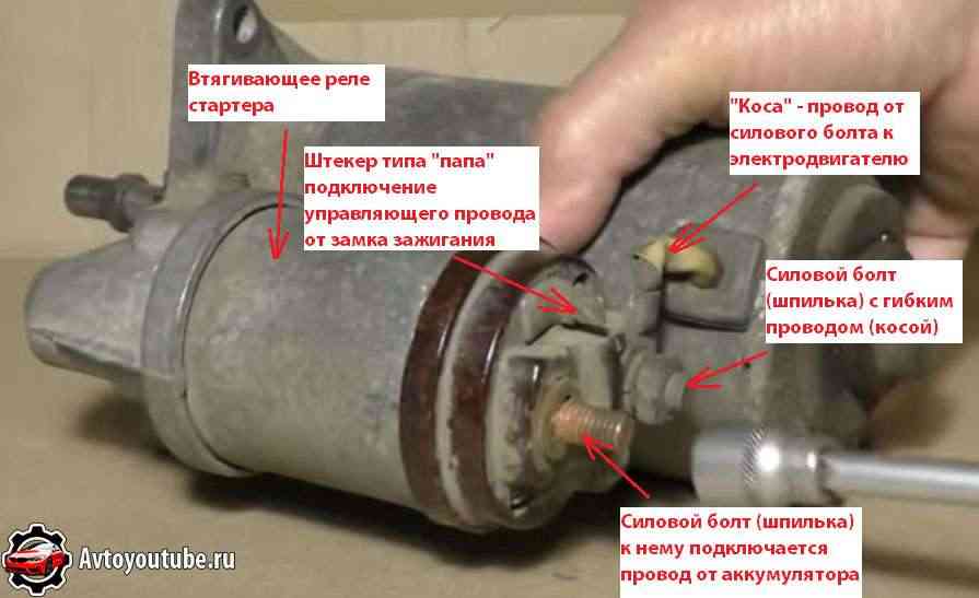 Втягивающее реле со стороны подключения автомобильной проводки имеет две шпильки с гайками, на одной из них установлена гибкая «коса», которая соединяет его и электродвигатель стартера. Третий контакт, он выглядит в виде штекера типа «папа» – подключение управляющего провода от замка зажигания.