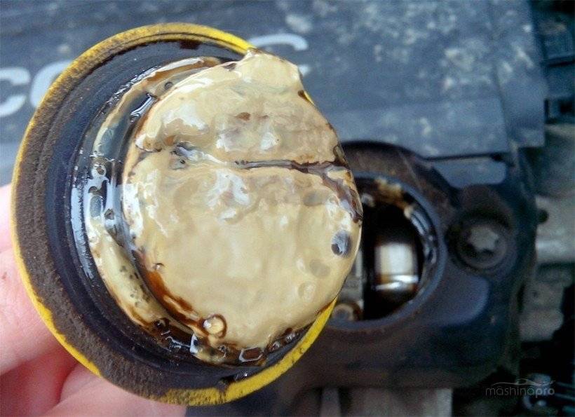 Также одной из наиболее распространенных неисправностей системы охлаждения является – утечка ОЖ в картер движка. Данная неисправность, может привести к достаточно серьезным последствиям и в значительной мере нарушить функцию движка. Выявить данную неисправность можно визуально осмотрев крышку масляного бачка. В случае если охлаждающая жидкость попадает в картер мотора, на крышке появляется белая эмульсия. Если же охлаждающая жидкость вытекает наружу, можно заметить образование под автомобилем.