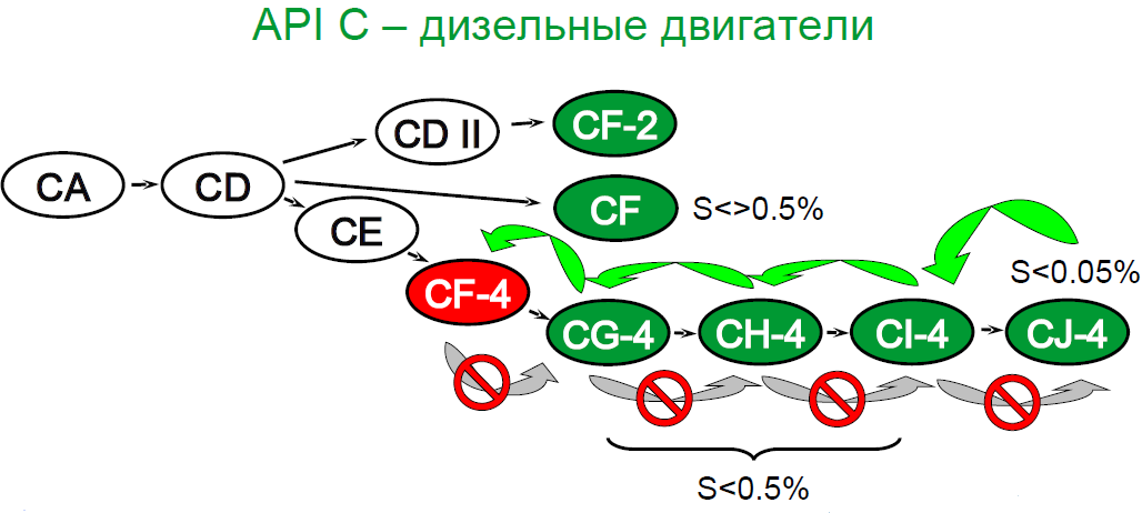 - CI-4 – современные дизельные автомобили, на которых установлена турбина, с клапаном EGR.