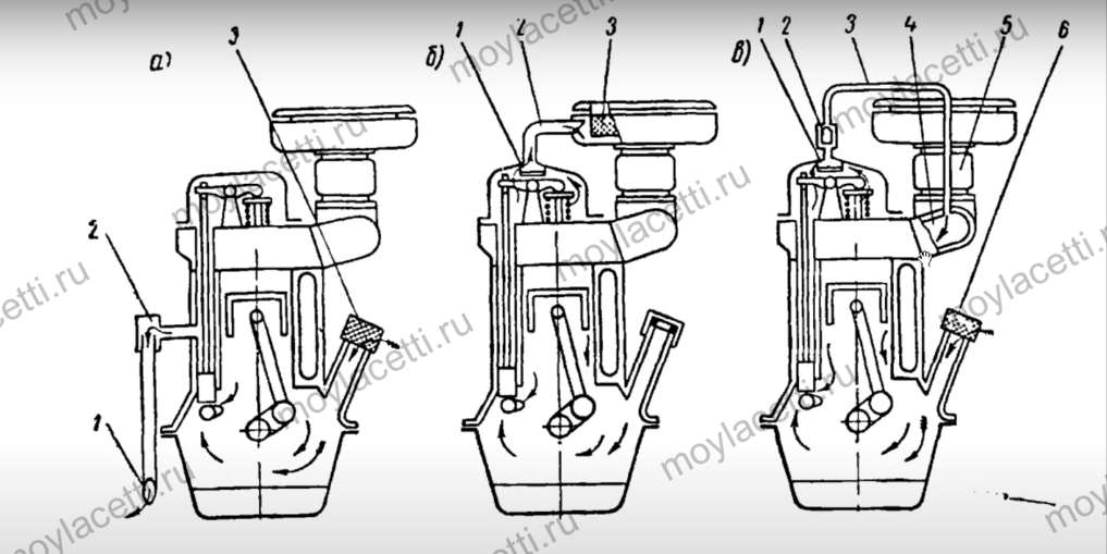 На первом рисунке (а) изображена вентилируемая система открытого типа. Воздух из вне заходит через маслозаливную горловину, циркулирует в полости картера и выводится с картерными газами через эжекционную трубку в атмосферу. Трубка имеет на конце косой срез. При движении автомобиля в районе этого среза создается область разрежения от встречного потока воздуха. Это позволяет улучшить отсос газов из картера.