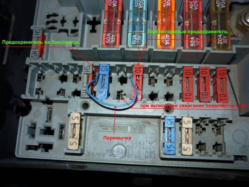 Извлеките из блока предохранителей элемент, отвечающий за работу бензонасоса (голубого цвета).