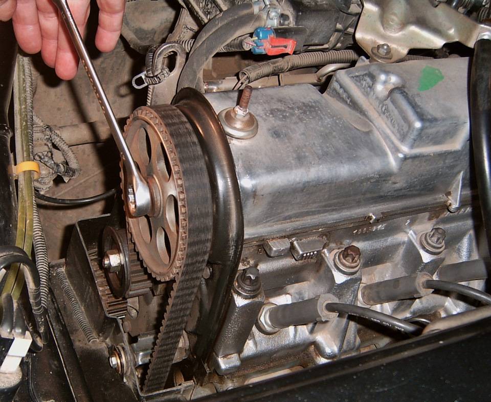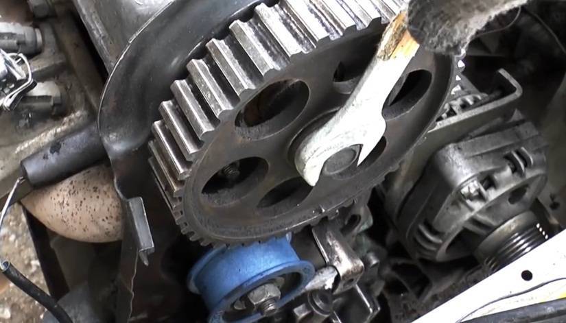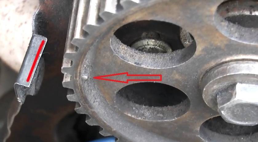 15.Теперь необходимо выставить распредвал и коленвал по меткам. Чтобы это осуществить, берем ключ на 17, накидываем его на болт фиксации шестерни распредвала и вращаем его, пока метка на ней не совпадет с выступом на внутренней защитной (металлической) крышке ремня. Далее, этим же ключом, накинутым на болт крепления шкива коленвала, вращаем коленвал до совпадения меток на шестерне привода ГРМ (высверленная воронка) и на корпусе двигателя (отлитый выступ).