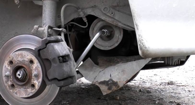 Автомобиль для выполнения работ нужно ставить в удобное положение и зафиксировать так, чтобы он не покатился, подложив что-нибудь под задние колеса.