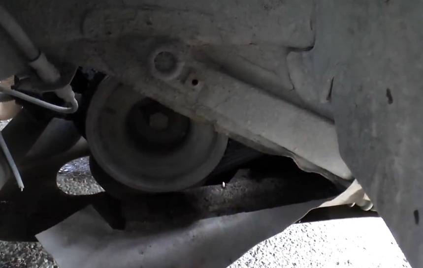 Если установлена защита картера, то можно попробовать ослабить болт крепления генератора из-под капота. Для этого понадобится головка на 13, но если защиты нет, то проще ослабить болт из-под машины рожковым ключом. Просто срываем гайку и отворачиваем её на несколько оборотов.