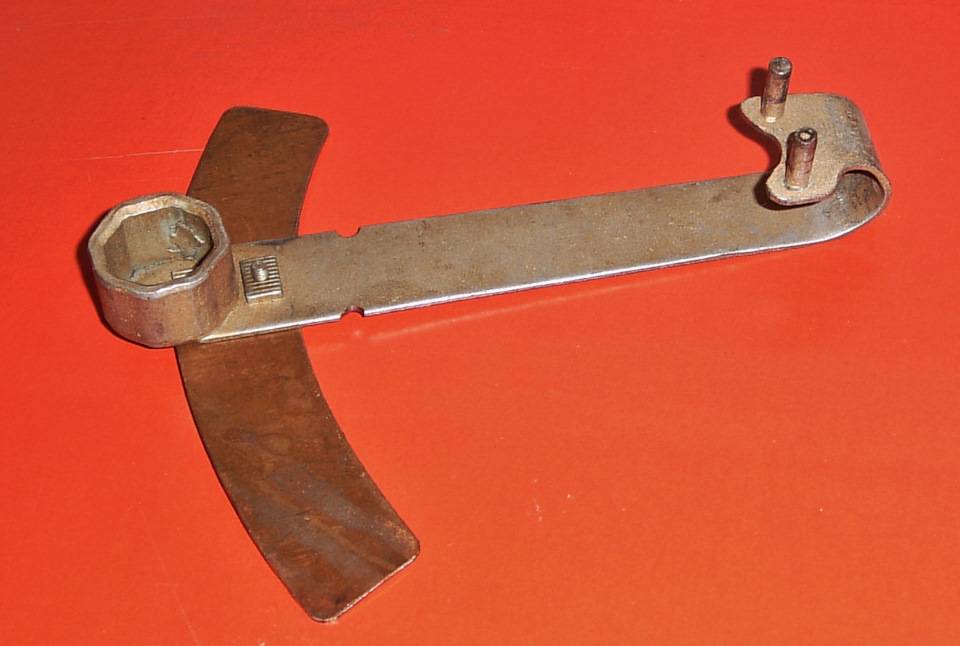 Спецключ для регулировки натяжения ремня ГРМ. Расстояние от штырьков до канавки для крючка динамометра 80 мм. Как потом оказалось, ключом можно работать и без дополнительного сектора