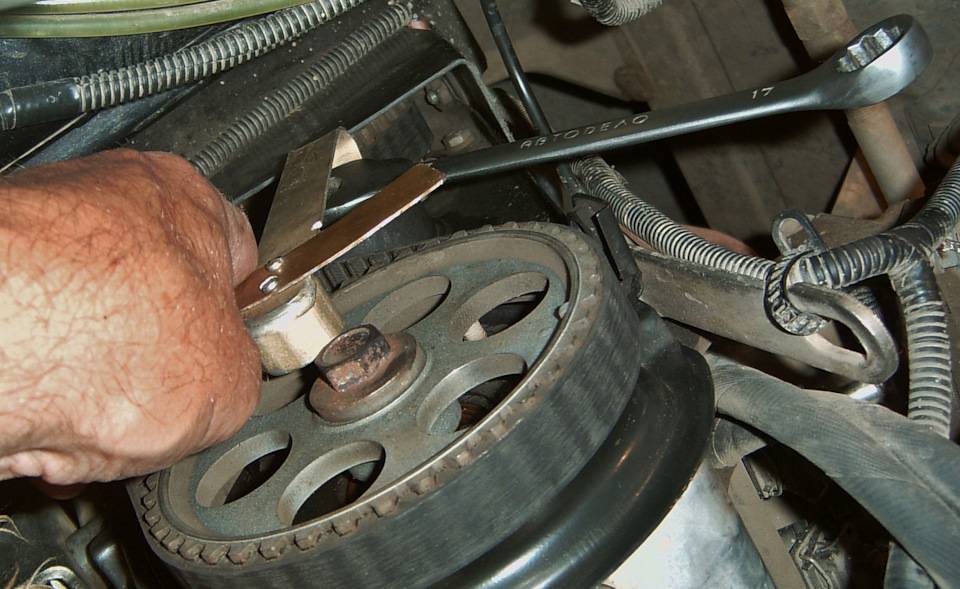 Когда метки выставлены, нужно зафиксировать коленчатый вал, чтобы он не проворачивался. Для этого нужно вставить отвертку между зубьями маховика, если на двигателе установлен инжектор. На двигателе с карбюратором коленвал фиксируется прямо на шкиве. После фиксации необходимо отвернуть крепежный болт и снять шкив генератора.