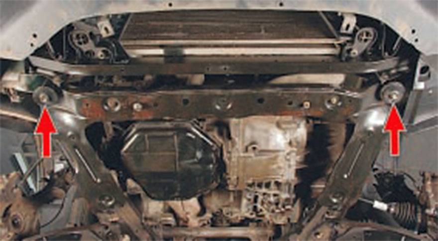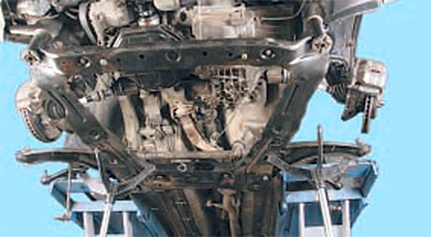 - Оттягиваем вниз подрамник, для того чтобы предоставить доступ к болтам крепления рулевой рейки.