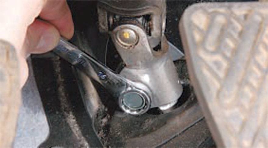 - В салоне откручиваем болт крепления рулевой рейки к рулю.