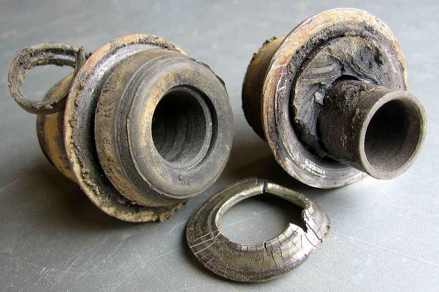 Разбитые сайлентблоки старой конструкции Ресурс сайлентблоков старой конструкции составлял от двух до трёх лет, в зависимости от интенсивности эксплуатации и климатических условий.