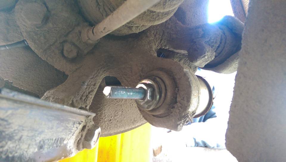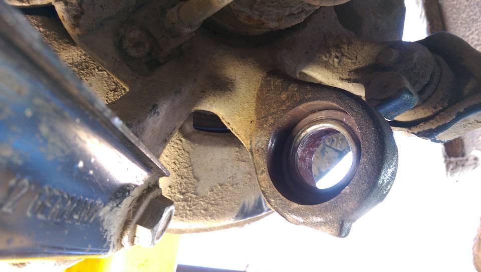 Но даже если нет съемника, сделать что-то подобное можно из подручного хлама в гараже. С этим настроем мы принялись за работу. Загнали машину на эстакаду, сняли колесо, убедились, что причина скрипа именно в плавающем. Как оказалось, у внутренней втулки был недопустимый вертикальный люфт.