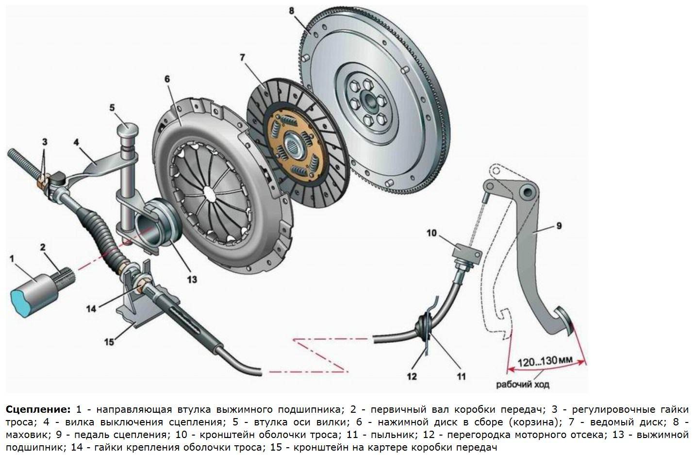 Схема сцепления на ваз 2110: 1 — направляющая втулка выжимного подшипника; 2 — первичный вал коробки передач; 3 — поводок троса; 4 — вилка выключения сцепления; 5 — втулка оси вилки; 6 — нажимной диск в сборе (корзина); 7 — ведомый диск; 8 — маховик; 9 — педаль сцепления; 10 — механизм автоматической регулировки длины троса; 13 — муфта выключения сцепления (выжимной подшипник); 14 — нижний наконечник оболочки троса; 15 — кронштейн, установленный на картере коробки передач; А — расстояние смещения поводка, проверяемое при установке троса (27 мм).