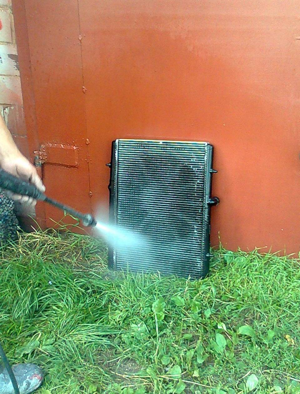 Промываем снаружи керхером, только остарожно, двигаем струю воды вдоль сот (т.к. соты алюминиевые) если поперек будет загибать пластинки сот.