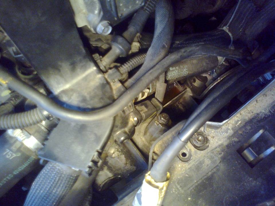 Во время разъединения трубок произойдет небольшой слив топлива, поэтому под них нужно предварительно подложить ветошь. Теперь проводку нужно убрать в сторону, для чего необходимо отсоединить ее от верхнего кожуха ГРМ. После этого берем второй домкрат и приподнимаем поддон двигателя. Делать это нужно через деревянную прокладку в виде бруска, например.