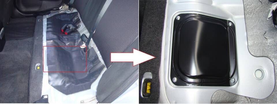 Установить коробку передач в нейтральное положение и зажать ручной тормоз. Снять заднее сиденье и убрать шумоизоляцию, под ней будет люк бензобака. Лючок топливного бака крепится на четырех саморезах.