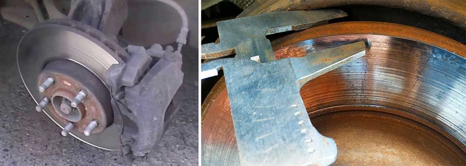 замерить толщину полностью изношенной накладки тормозной колодки с достаточной степенью точности затруднительно. Поэтому измерьте общую толщину колодки и из полученного значения вычтите толщину основания колодки (2,0 мм).