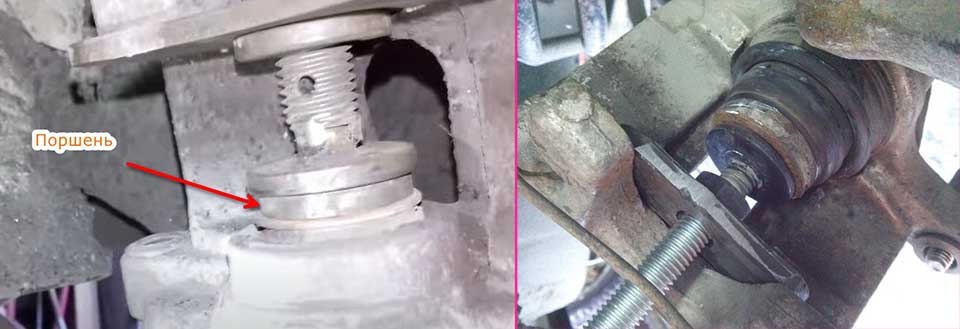 Для корректного снятия задних колодок дисковых тормозов необходимо давить на поршень и одновременно вкручивать его по часовой стрелке. Сделать это без специального приспособления сложно.
